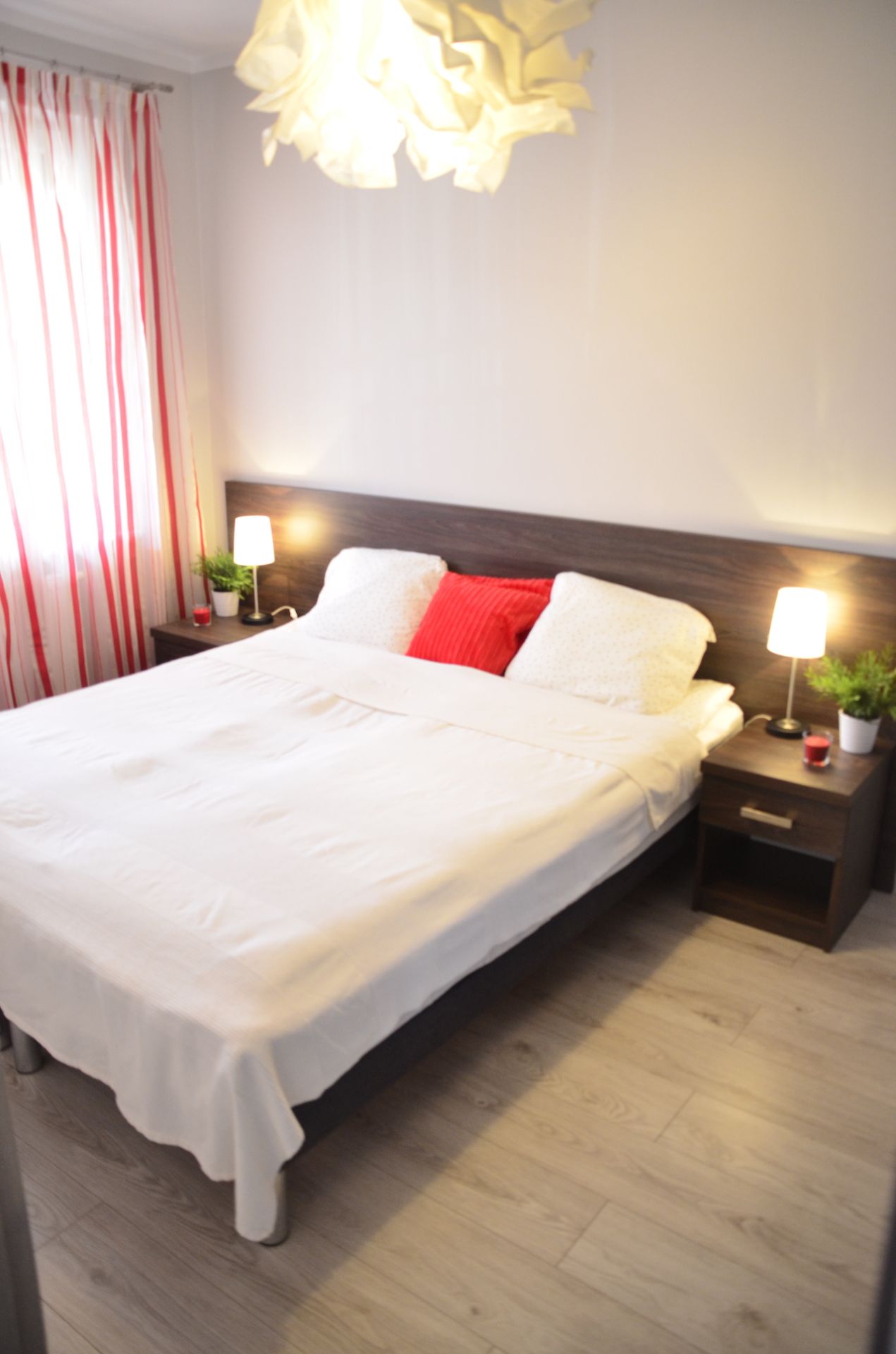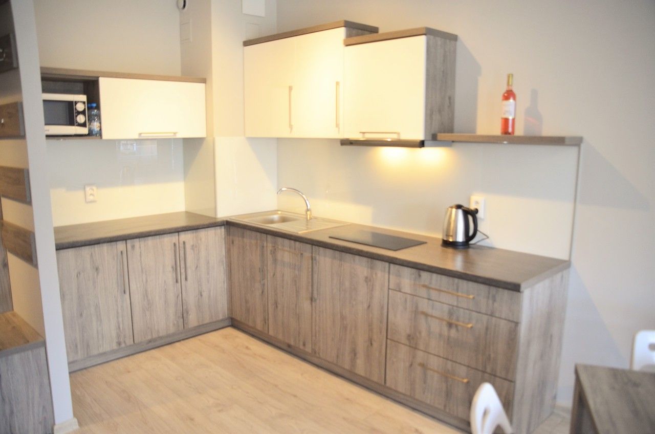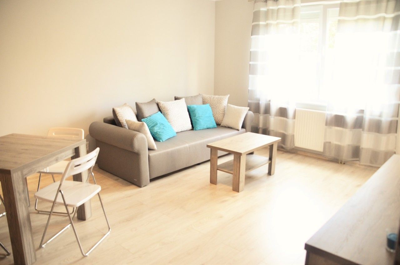 Apartament składa się z sypialni z wygodnym łóżkiem małżeńskim oraz częścią wypoczynkową, w której znajduje się sofa oraz telewizor z płaskim ekranem. Na gości czeka także w pełni wyposażony aneks kuchenny, w którym znajdują się m.in. lodówka, kuchenka mikrofalowa, czajnik oraz zestaw naczyń i sztućców.